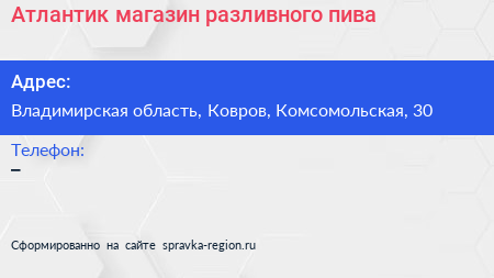 Атлантик, магазин разливного пива по адресу Владимирская область, Ковров, Комсомольская, 30 в дальнейшем Организация, размещена в следующих категориях: