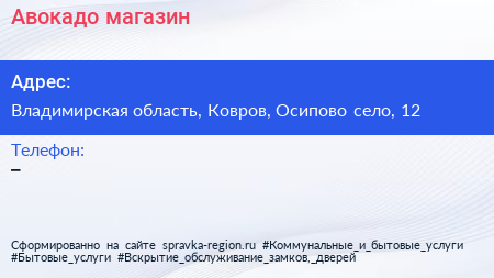 Авокадо, магазин по адресу Владимирская область, Ковров, Осипово село, 12 в дальнейшем Организация, размещена в следующих категориях: