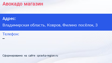 Авокадо, магазин по адресу Владимирская область, Ковров, Филино посёлок, 3 в дальнейшем Организация, размещена в следующих категориях: