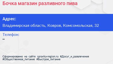 Бочка, магазин разливного пива по адресу Владимирская область, Ковров, Комсомольская, 32 в дальнейшем Организация, размещена в следующих категориях: