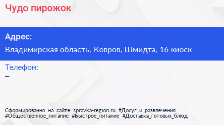 Чудо-пирожок по адресу Владимирская область, Ковров, Шмидта, 16 киоск в дальнейшем Организация, размещена в следующих категориях: