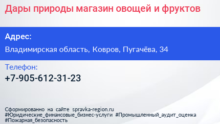 Дары природы, магазин овощей и фруктов по адресу Владимирская область, Ковров, Пугачёва, 34 в дальнейшем Организация, размещена в следующих категориях: