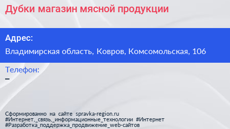 Дубки, магазин мясной продукции по адресу Владимирская область, Ковров, Комсомольская, 106 в дальнейшем Организация, размещена в следующих категориях:
