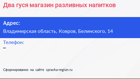 Два гуся, магазин разливных напитков по адресу Владимирская область, Ковров, Белинского, 14 в дальнейшем Организация, размещена в следующих категориях: