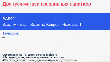 Два гуся, магазин разливных напитков по адресу Владимирская область, Ковров, Моховая, 1 в дальнейшем Организация, размещена в следующих категориях: