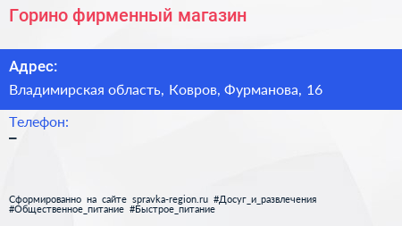 Горино, фирменный магазин по адресу Владимирская область, Ковров, Фурманова, 16 в дальнейшем Организация, размещена в следующих категориях: