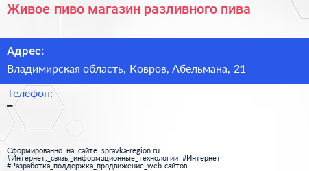 Живое пиво, магазин разливного пива по адресу Владимирская область, Ковров, Абельмана, 21 в дальнейшем Организация, размещена в следующих категориях: