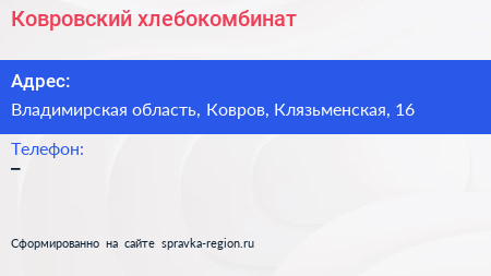 Ковровский хлебокомбинат по адресу Владимирская область, Ковров, Клязьменская, 16 в дальнейшем Организация, размещена в следующих категориях: