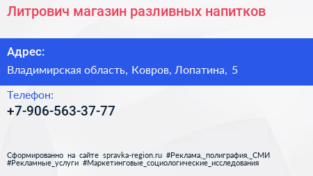 Литрович, магазин разливных напитков по адресу Владимирская область, Ковров, Лопатина, 5 в дальнейшем Организация, размещена в следующих категориях: