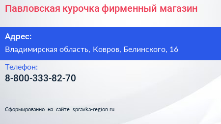 Павловская курочка, фирменный магазин по адресу Владимирская область, Ковров, Белинского, 16 в дальнейшем Организация, размещена в следующих категориях: