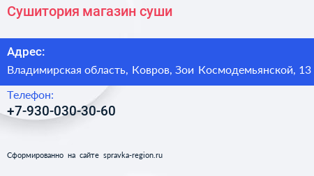 Сушитория, магазин суши по адресу Владимирская область, Ковров, Зои Космодемьянской, 13 в дальнейшем Организация, размещена в следующих категориях: