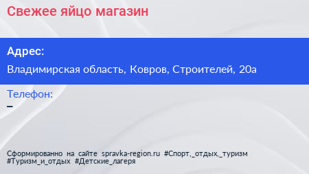 Свежее яйцо, магазин по адресу Владимирская область, Ковров, Строителей, 20а в дальнейшем Организация, размещена в следующих категориях: