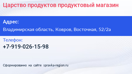 Царство продуктов, продуктовый магазин по адресу Владимирская область, Ковров, Восточная, 52/2а в дальнейшем Организация, размещена в следующих категориях: