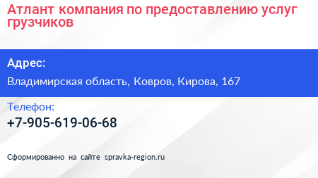 Атлант, компания по предоставлению услуг грузчиков по адресу Владимирская область, Ковров, Кирова, 167 в дальнейшем Организация, размещена в следующих категориях: