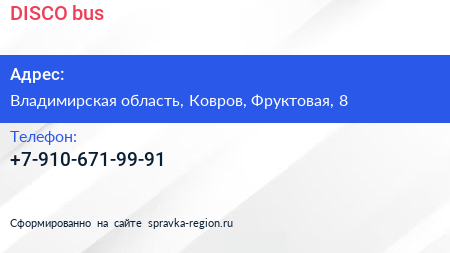 DISCO bus по адресу Владимирская область, Ковров, Фруктовая, 8 в дальнейшем Организация, размещена в следующих категориях: