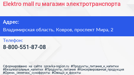 Elektro-mall.ru, магазин электротранспорта по адресу Владимирская область, Ковров, проспект Мира, 2 в дальнейшем Организация, размещена в следующих категориях: