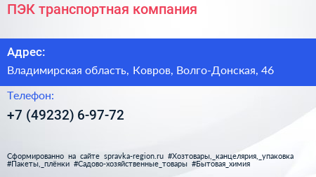ПЭК, транспортная компания по адресу Владимирская область, Ковров, Волго-Донская, 46 в дальнейшем Организация, размещена в следующих категориях:
