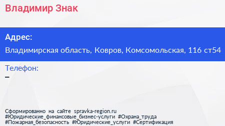 Владимир-Знак по адресу Владимирская область, Ковров, Комсомольская, 116 ст54 в дальнейшем Организация, размещена в следующих категориях: