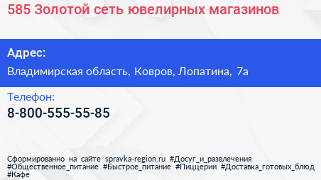 585 Золотой, сеть ювелирных магазинов по адресу Владимирская область, Ковров, Лопатина, 7а в дальнейшем Организация, размещена в следующих категориях: