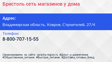 Бристоль, сеть магазинов у дома по адресу Владимирская область, Ковров, Строителей, 27/4 в дальнейшем Организация, размещена в следующих категориях: