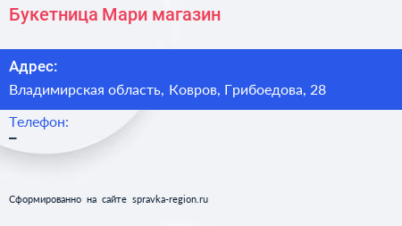 Букетница Мари, магазин по адресу Владимирская область, Ковров, Грибоедова, 28 в дальнейшем Организация, размещена в следующих категориях: