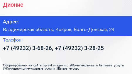 Дионис по адресу Владимирская область, Ковров, Волго-Донская, 24 в дальнейшем Организация, размещена в следующих категориях: