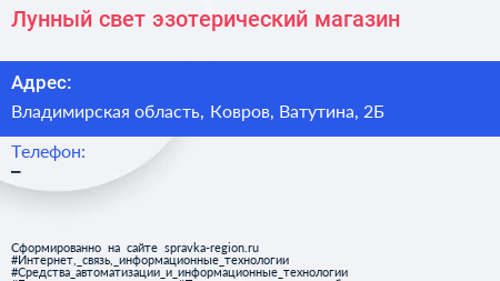 Лунный свет, эзотерический магазин по адресу Владимирская область, Ковров, Ватутина, 2Б в дальнейшем Организация, размещена в следующих категориях: