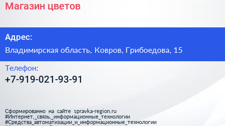 Магазин цветов по адресу Владимирская область, Ковров, Грибоедова, 15 в дальнейшем Организация, размещена в следующих категориях: