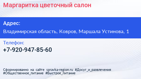Маргаритка, цветочный салон по адресу Владимирская область, Ковров, Маршала Устинова, 1 в дальнейшем Организация, размещена в следующих категориях: