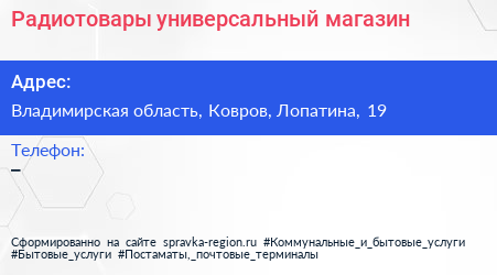 Радиотовары, универсальный магазин по адресу Владимирская область, Ковров, Лопатина, 19 в дальнейшем Организация, размещена в следующих категориях: