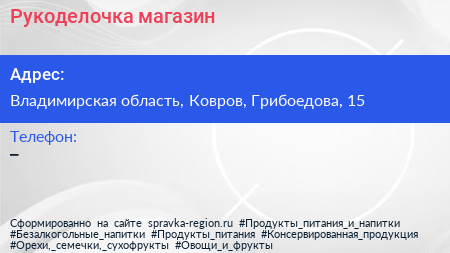 Рукоделочка, магазин по адресу Владимирская область, Ковров, Грибоедова, 15 в дальнейшем Организация, размещена в следующих категориях: