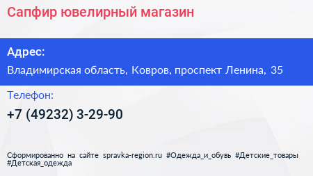 Сапфир, ювелирный магазин по адресу Владимирская область, Ковров, проспект Ленина, 35 в дальнейшем Организация, размещена в следующих категориях: