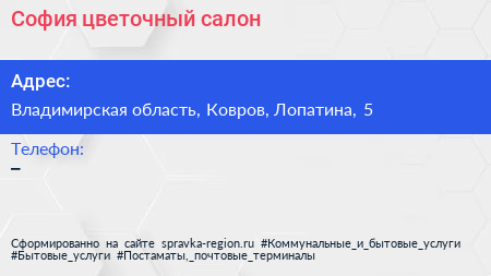 София, цветочный салон по адресу Владимирская область, Ковров, Лопатина, 5 в дальнейшем Организация, размещена в следующих категориях: