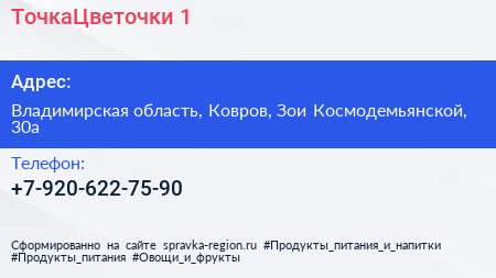 ТочкаЦветочки №1 по адресу Владимирская область, Ковров, Зои Космодемьянской, 30а в дальнейшем Организация, размещена в следующих категориях: