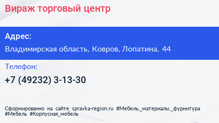 Вираж, торговый центр по адресу Владимирская область, Ковров, Лопатина, 44 в дальнейшем Организация, размещена в следующих категориях:
