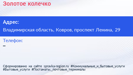 Золотое колечко по адресу Владимирская область, Ковров, проспект Ленина, 29 в дальнейшем Организация, размещена в следующих категориях: