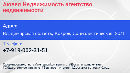 Аювел Недвижимость, агентство недвижимости по адресу Владимирская область, Ковров, Социалистическая, 20/1 в дальнейшем Организация, размещена в следующих категориях: