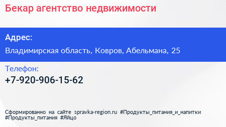 Бекар, агентство недвижимости по адресу Владимирская область, Ковров, Абельмана, 25 в дальнейшем Организация, размещена в следующих категориях: