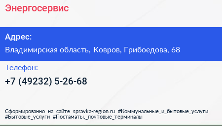 Энергосервис по адресу Владимирская область, Ковров, Грибоедова, 68 в дальнейшем Организация, размещена в следующих категориях: