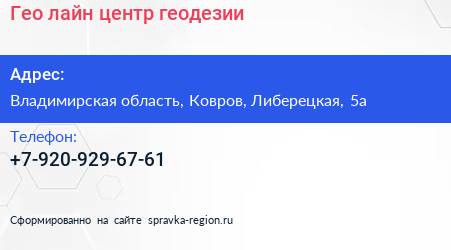 Гео-лайн, центр геодезии по адресу Владимирская область, Ковров, Либерецкая, 5а в дальнейшем Организация, размещена в следующих категориях:
