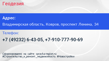 Геодезия по адресу Владимирская область, Ковров, проспект Ленина, 34 в дальнейшем Организация, размещена в следующих категориях: