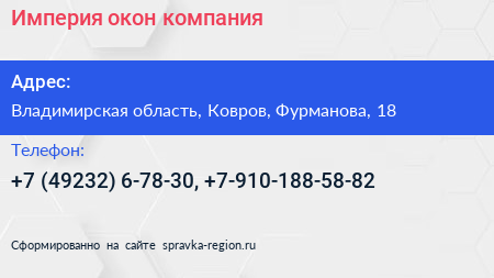 Империя окон, компания по адресу Владимирская область, Ковров, Фурманова, 18 в дальнейшем Организация, размещена в следующих категориях: