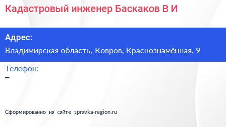 Кадастровый инженер Баскаков В.И. по адресу Владимирская область, Ковров, Краснознамённая, 9 в дальнейшем Организация, размещена в следующих категориях: