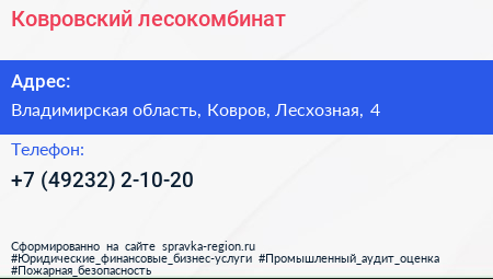 Ковровский лесокомбинат по адресу Владимирская область, Ковров, Лесхозная, 4 в дальнейшем Организация, размещена в следующих категориях:
