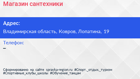 Магазин сантехники по адресу Владимирская область, Ковров, Лопатина, 19 в дальнейшем Организация, размещена в следующих категориях: