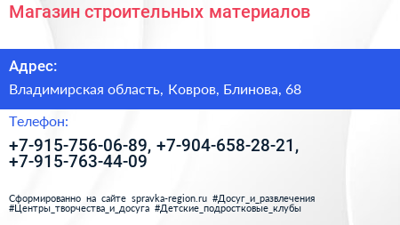 Магазин строительных материалов по адресу Владимирская область, Ковров, Блинова, 68 в дальнейшем Организация, размещена в следующих категориях: