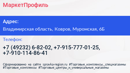МаркетПрофиль по адресу Владимирская область, Ковров, Муромская, 6Б в дальнейшем Организация, размещена в следующих категориях: