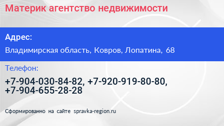 Материк, агентство недвижимости по адресу Владимирская область, Ковров, Лопатина, 68 в дальнейшем Организация, размещена в следующих категориях: