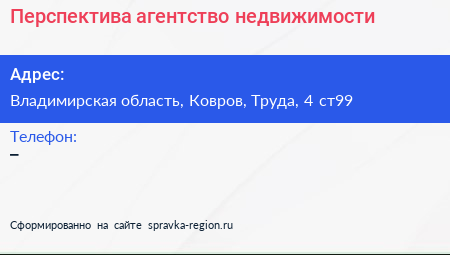 Перспектива, агентство недвижимости по адресу Владимирская область, Ковров, Труда, 4 ст99 в дальнейшем Организация, размещена в следующих категориях: