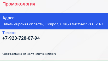 Промэкология по адресу Владимирская область, Ковров, Социалистическая, 20/1 в дальнейшем Организация, размещена в следующих категориях: